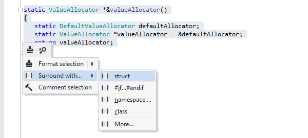 ReSharper C++ 提供了 29 种可自定义的模板。 其中一些为常规代码段,其他的则专门用于包围代码选择。