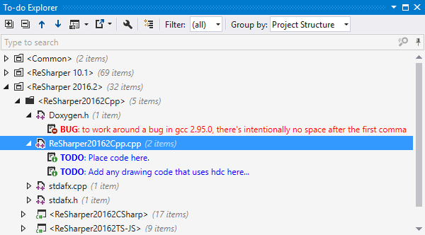 借助 To-do Explorer 工具窗口,您可以查看、分组和筛选注释,这些注释包含 3 个默认待办事项模式(Bug、Todo 和 Not Implemented)中的一个和您想要设置的任何自定义模式。