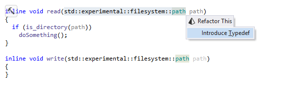 Introduce typedef 重构让您能够为选定的数据类型快速创建 typedef,并将此数据类型及其所有实例替换为新创建的 typedef。