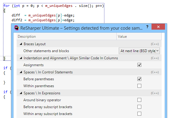 通常情况下,自定义格式化设置更加简单,只需在现有代码中检测它们。 使用 ReSharper | Edit | Detect 格式化设置菜单可让 ReSharper 检测代码格式化设置。 您将获得包含检测到的值的工具窗口,您可以在计算机上检查这些值并应用到 ReSharper 设置。 或者,您也可以将它们保存到团队共享的设置层中,以便团队中的其他开发者在打开当前解决方案时获得相同的代码格式化配置。