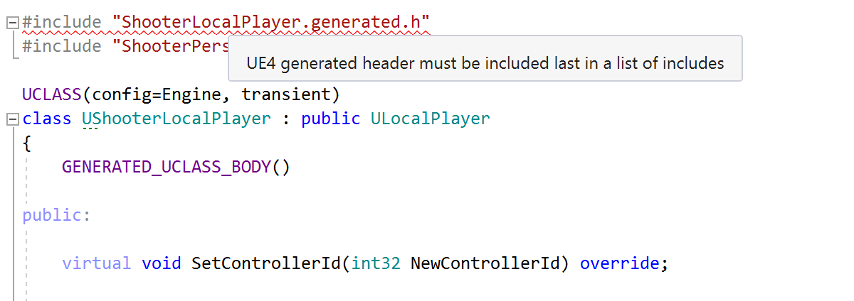 当您使用当前范围中不可用的符号时,ReSharper C++ 会以红色高亮显示并建议添加缺失的 #include(如可能)。 当头文件中缺少 #include 时,系统会在 .generated.h(includes 列表中的最后一项)之前插入它。 位置不正确的 #include 通过对应的检查高亮显示。