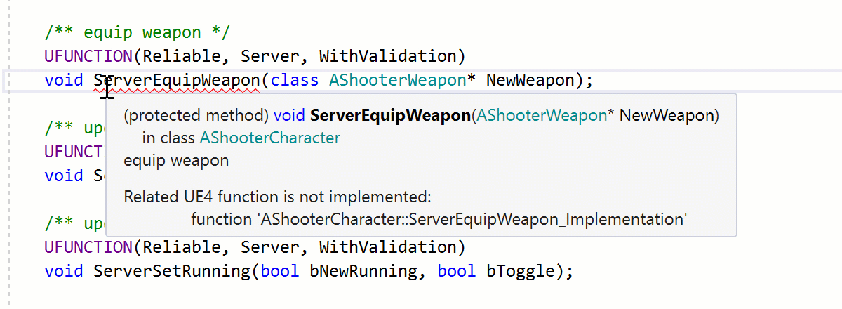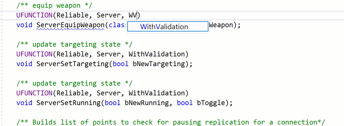 ReSharper C++ 可在 UFUNCTION 声明语句中通过 Client、Server 或 NetMulticast 关键字标识 RPC。 对于此类函数,ReSharper C++ 可以意识到应当生成 _Implementation 函数和 _Validate 函数(如果 WithValidation 置 1)。 它可以生成两个函数(两者同时缺失)或只生成一个(如果一个缺失)。
