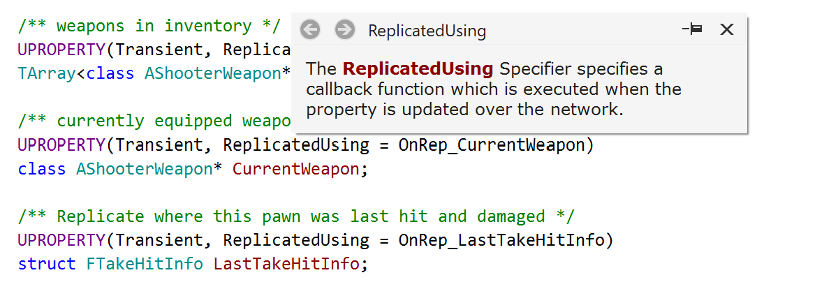 当文本光标位于说明符上时,UE 反射说明符的内置文档将显示在 Quick Documentation 弹出窗口 (Ctrl+Q) 中。
