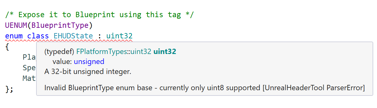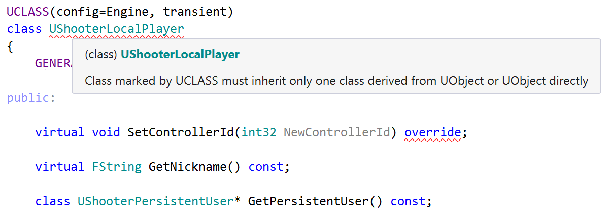 ReSharper C++ 提供了与 UnrealHeaderTool 的无缝集成,帮助您直接在编辑器中捕获有关 Unreal Engine 类元数据的更多问题。 处理 Unreal Engine 项目时,ReSharper C++ 将在您正在编辑的文件上自动运行 UnrealHeaderTool,并显示任何错误或警告,就像其他检查一样。 观看实际运行中的 UnrealHeaderTool 集成。