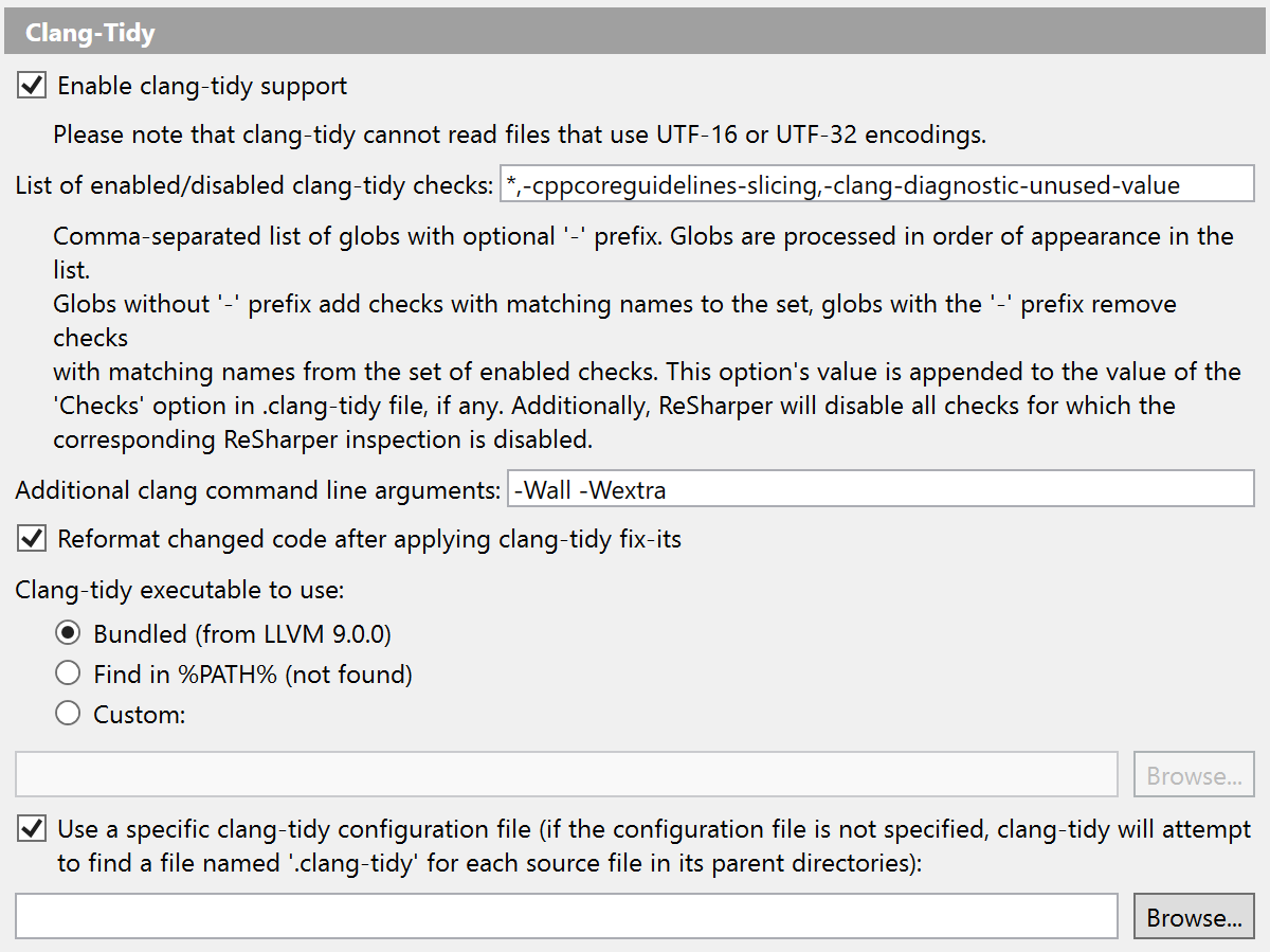 ReSharper C++ 与 Clang-Tidy 无缝集成,后者是一款功能强大、基于 Clang 编译器的开源代码分析工具。 集成提供了代码检查和快速修复。