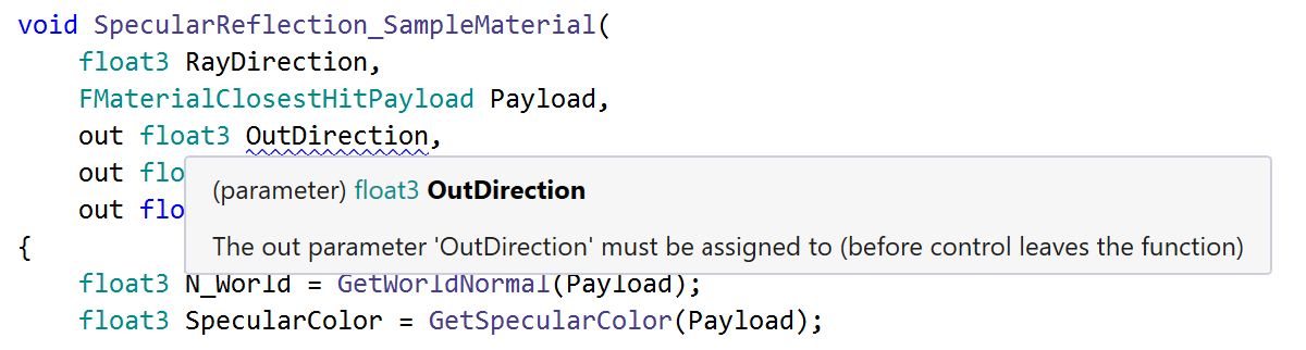 ReSharper C++ 为高级着色器语言 (HLSL) 提供了初步支持。 ReSharper C++ 会根据您的默认配色方案高亮显示 HLSL 代码并显示代码元素的嵌入提示和工具提示以及类型信息和文档。 您还可以搜索并快速导航到结构、函数或整个解决方案中的参数、引用的文件和标准库。 为了使 HLSL 体验更完美,ReSharper C++ 为您提供了智能代码补全、自动插入匹配分隔符,等等。