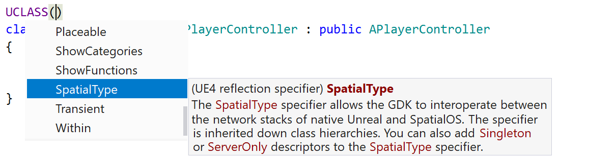 SpatialOS 游戏开发工具包是一个 Unreal Engine 4 复刻,可以帮助您在云中运行和管理在线游戏。 ReSharper C++ 可以识别 CrossServer、SpatialType、NonSpatialType 和其他 SpatialOS 说明符。 了解更多。