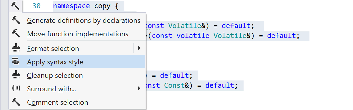 除了重构,ReSharper C++ 还提供了一组上下文操作:局部代码转换,通常可以帮助您在替代语法选项之间切换。 与快速修复相似,您按 Alt+Enter 就可以调用这些操作。