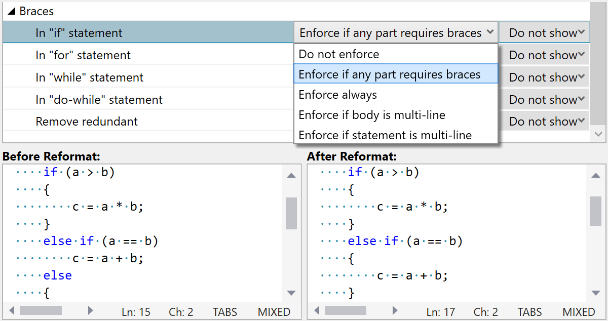 作为深挖所有可用代码格式化选项的替代,您可以选择代码块并仅配置适用于此特定块的规则。