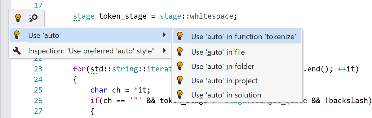 例如,您可以快速将 auto 替换为显式类型或将类型替换为 auto。 其他上下文操作能够帮助您合并嵌套的 if 语句,在切换枚举时生成缺失的 case 语句,替换宏调用或 typedef,等等。