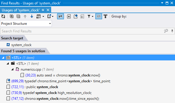 使用 Find Usages 可在解决方案的 C++ 代码中搜索特定符号的所有引用。