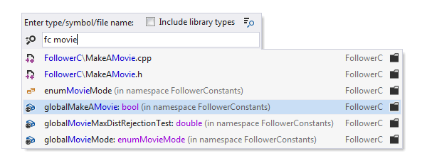 所有这些命令都支持基于 lowerCamelCase 的搜索和按照路径筛选。 例如,在 Go to Everything 弹出窗口中输入fc movie 会返回文件和文件成员列表,它们的名称中包含字符串 movie 并属于 FollowerC 项目或 FollowerConstants 命名空间(两者都匹配 fc)。