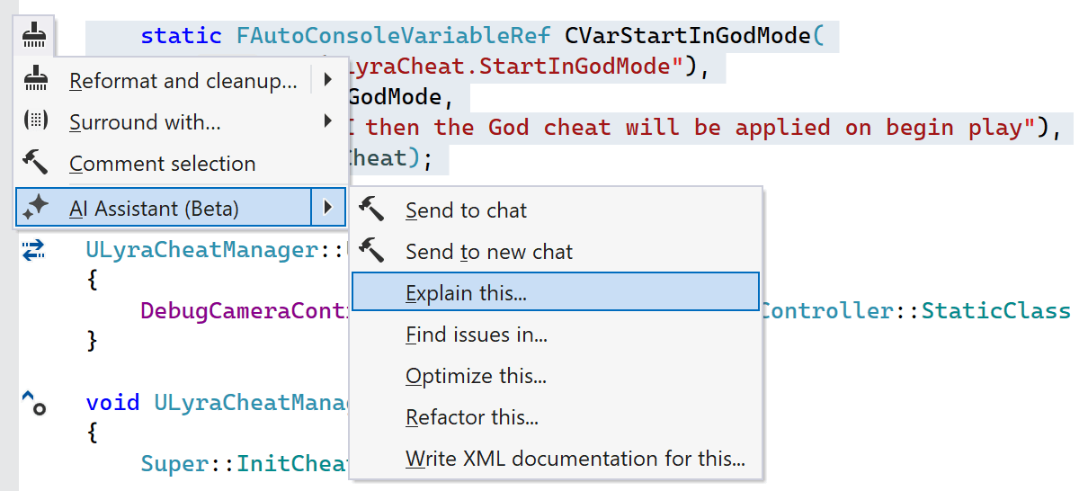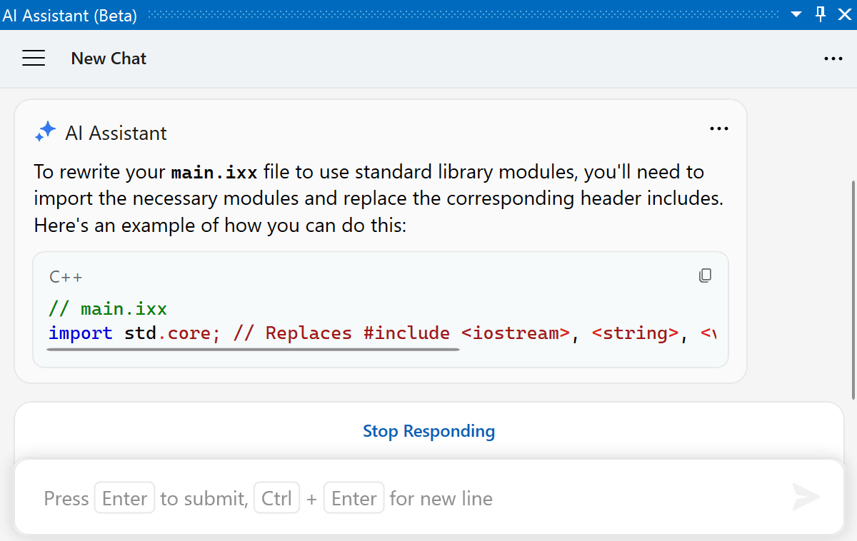 ReSharper C++ 2023.2 引入了 ReSharper AI Assistant – 这种 AI 驱动聊天工具专门用于回答编程问题,帮助您进行故障排除、重构、记录和其他开发工作流。