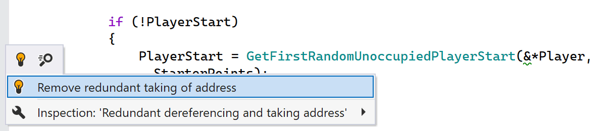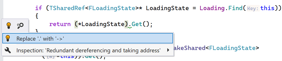 ReSharper C++ 2023.2 添加了一项新检查,可以用于检测冗余的解引用和寻址运算符。 它为您提供了多种快速修复,帮助简化成员访问并移除冗余运算符。