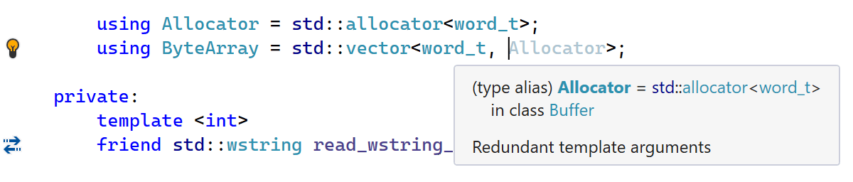 另一项新检查可以高亮显示与相应默认模板实参匹配且可以省略的冗余模板实参。