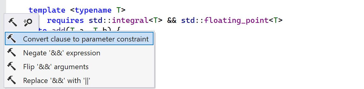 两个新增的互补上下文操作可帮助您将模板形参约束移至 requires 子句,以及将 requires 子句转换为模板形参约束。