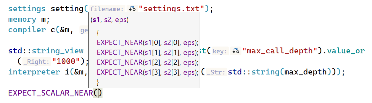 ReSharper C++ 2023.1 在 Quick Documentation(快速文档)弹出窗口和悬停工具提示中为宏替换引入了适当的高亮显示和格式化。 在 2023.2 版本中,这些改进也适用于代码补全中的宏定义和 Parameter Info(形参信息)。