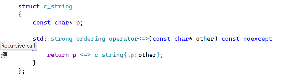 如果您有递归调用,ReSharper C++ 将在装订区域中标记,使其更加明显。