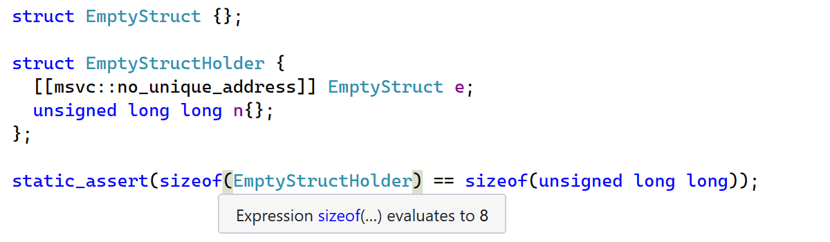 C++20 新增的 [[no_unique_address]] 特性表明类的非 static 数据成员不需要唯一地址,允许编译器以更有效的方式布局类的成员。 现在,ReSharper C++ 在计算对象的大小时会考虑 [[no_unique_address]]。