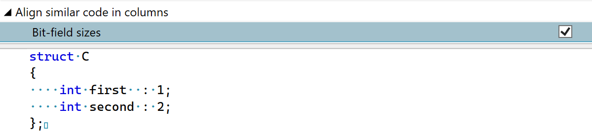 这个版本对位字段成员的格式化带来了多项改进。 在列中对齐初始值设定项和声明名称的选项现在支持位字段。 还有两个新的格式化设置,用于位字段声明中冒号前后的空格以及列中位字段大小的对齐。