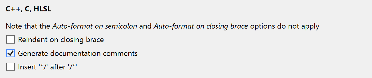 新的输入辅助选项可让您关闭文档注释的生成,避免与 Visual Studio 的内置生成器冲突(ReSharper | Options | Environment | Editor | Behavior | C++, C, HLSL | Generate documentation comments(ReSharper | 选项 | 环境 | 编辑器 | 行为 | C++、C、HLSL | 生成文档注释))。