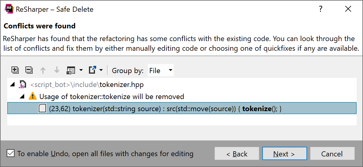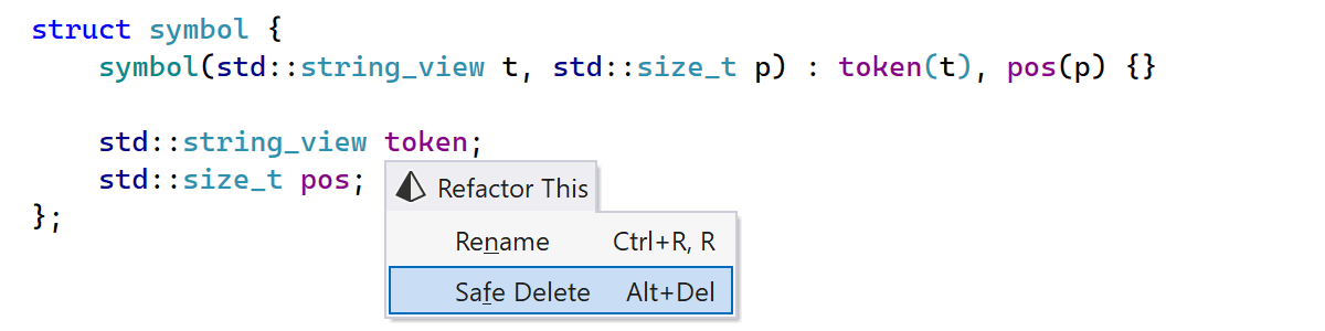 ReSharper C++ 引入了 Safe Delete(安全删除)重构,让您可以从源代码安全移除符号。 这种重构适用于类、函数、变量、枚举器、命名空间,甚至概念。