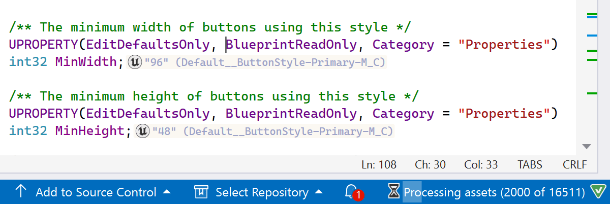这个版本为蓝图索引编制带来了性能改进。 当您第一次打开项目时,ReSharper C++ 将为所有蓝图资源编制索引,驱动 Find Usages(查找用法)等功能,并直接在文本编辑器中显示序列化数据的值。