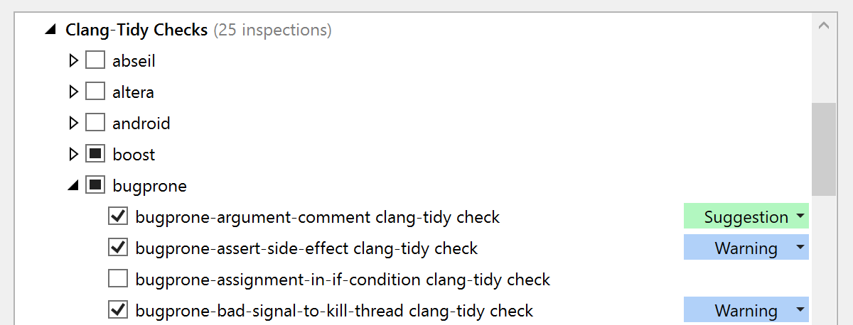 现在,Clang-Tidy 检查在 Inspection Severity(检查严重性)设置页面中按前缀分组,让您更容易导航到特定检查并快速启用或禁用整个检查组。