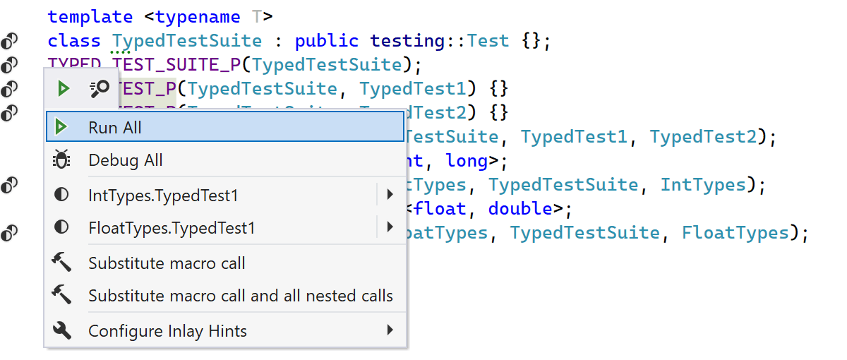 现在可以从源代码中发现参数化测试而无需执行。 因此,您现在可以使用装订区域图标和上下文操作直接从编辑器运行整个测试套件和单独的参数化测试。