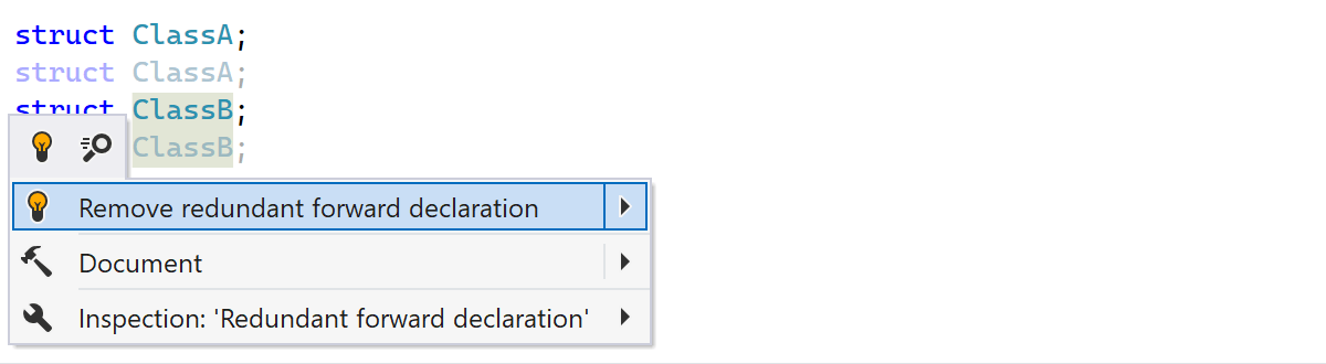 新的 Redundant forward declaration(冗余前向声明)检查可以检测同一文件中的重复前向类声明,并提供快速修复进行清理。