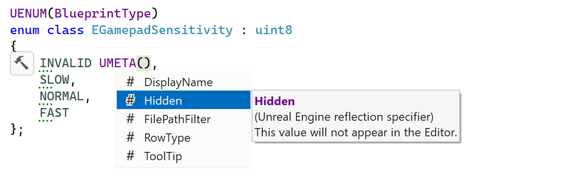 此外,ReSharper C++ 现在将识别并高亮显示 UMETA 和 UPARAM 反射宏,为这些宏及其特性提供代码补全和工具提示文档。