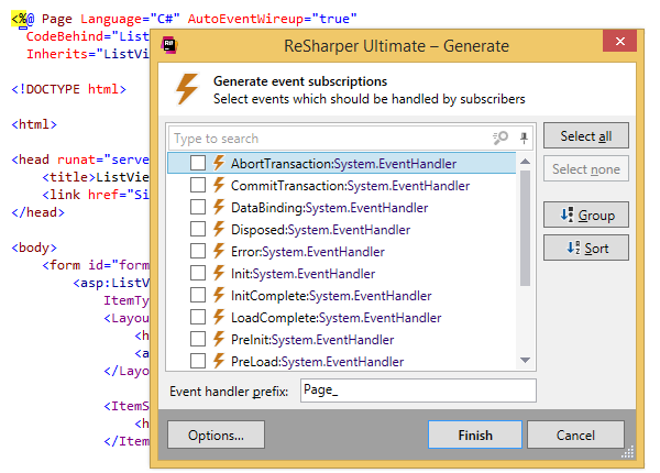 另一个功能是在ASP.NET代码隐藏文件中生成事件订阅方法。