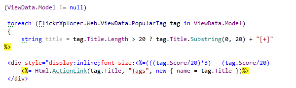当您使用 C# 或 VB.NET 在 aspx 页面中内联代码渲染块时,ReSharper 的语法高亮显示可以帮助您实现以下操作: