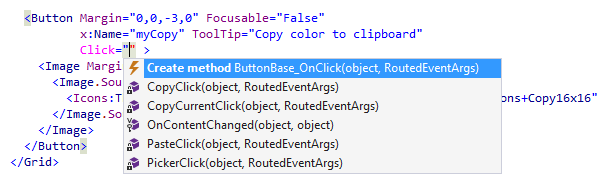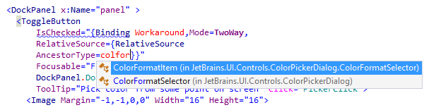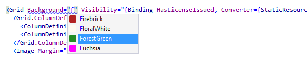 ReSharper代码补全的另一个振奋人心的优势是,它显示了在Background或OpacityMask等特性中预期的画笔颜色。