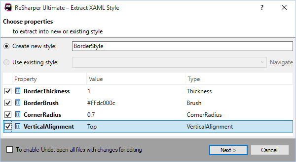 在XAML中,为多个控件定义内联样式,然后将它们重定位到样式定义是一种常见情况。 通过Extract Style重构,ReSharper使这项操作变得轻而易举。