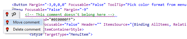 在元素中意外放置注释时,ReSharper将高亮显示该注释并提供解决错误的选项。