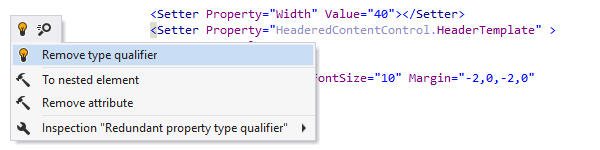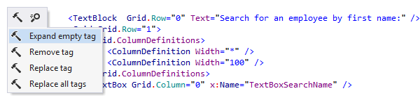 ReSharper 支持各种上下文操作,可简化 XML 语法的使用流程,并且可以在 XAML 中使用。 举几个例子,您可以使用其他名称替换标记名称,将特性转换为嵌套元素,或移除标记并将其子项提升一个级别。