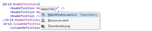 在 XAML 文件中按 Ctrl+Alt+F7 时,您将获得所有相关文件的列表:例如,代码隐藏文件、当前 XAML 文件中引用的任何资源或控件中使用的图像。