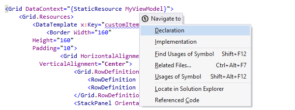 ReSharper 的 Navigate To 菜单处理 XAML 代码元素的方式与在 C# 代码文件中的处理方式相同。 在符号声明或用法上按Alt+`可以打开一个包含多个可能的导航目标的菜单。