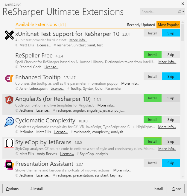 从版本8.0开始,ReSharper包含Extension Manager(在Visual Studio中为),有助于发现和获取关于插件的其他信息,以及安装和卸载插件。