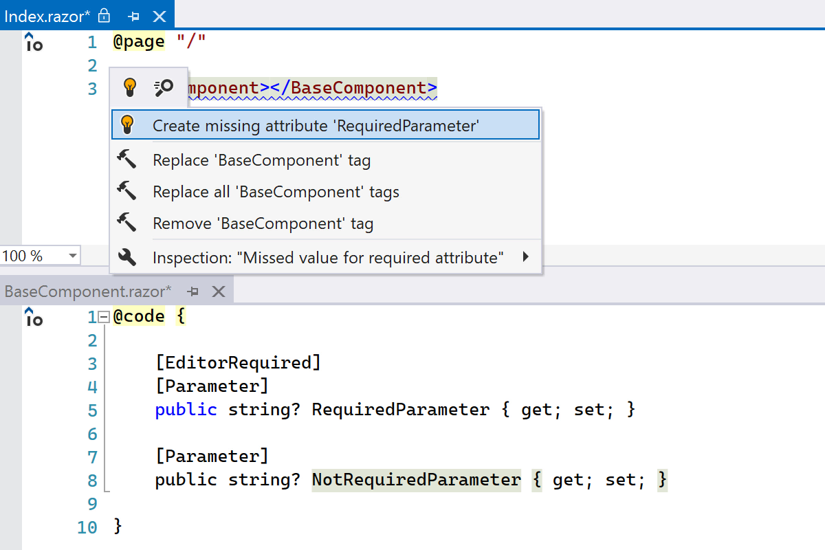 [EditorRequired] 特性的支持。 如果您想使用 Blazor 组件而不指定所需形参,也可以使用相应的检查和快速修复。 .razor 文件中的代码清理。 它不再移除所有 @using 声明。