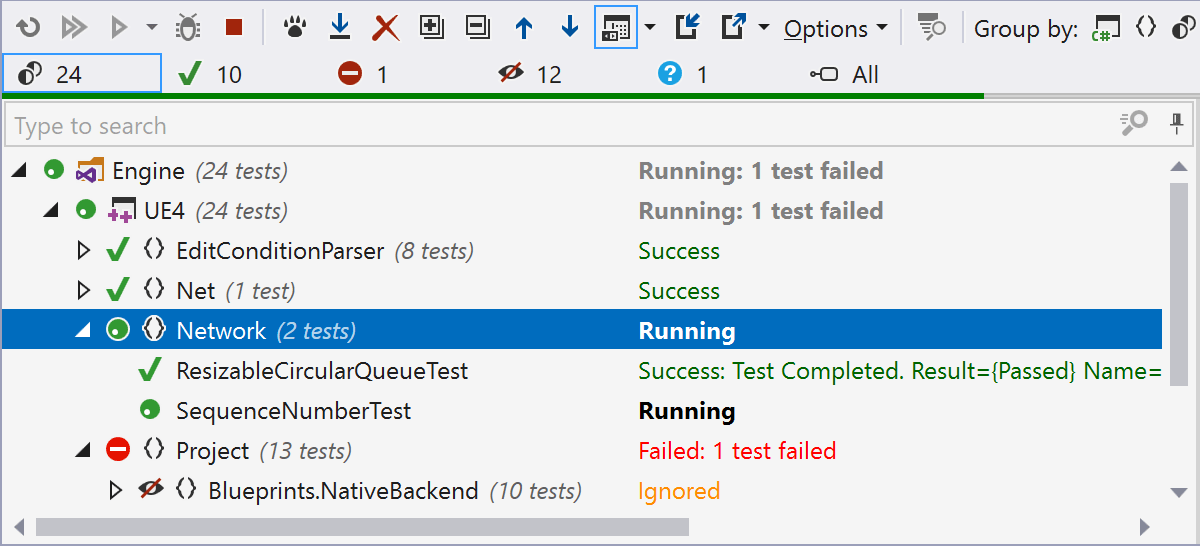 现在支持 虚幻引擎测试框架。 ReSharper C++ 能够发现 Unreal Engine 单元测试,并在编辑器中的每个测试旁添加相应的操作指示器,用于运行或调试测试或整个测试套件。 在 Unit Test Sessions(单元测试会话)窗口中,您可以检查测试结果,重新运行失败测试、所有测试或特定测试。