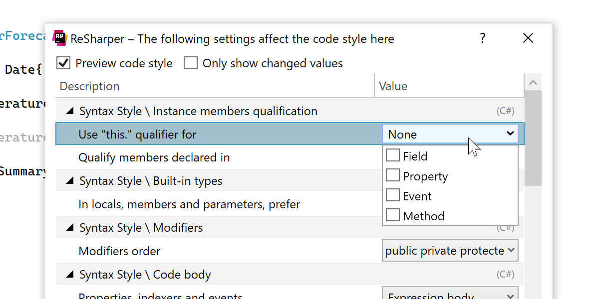 除了这些更改之外,语法样式设置现已添加至 Configure code style(配置代码样式)和 Autodetect code style settings(自动检测代码样式设置)操作。 Preview code style(预览代码样式)面板也会显示语法样式的更改。