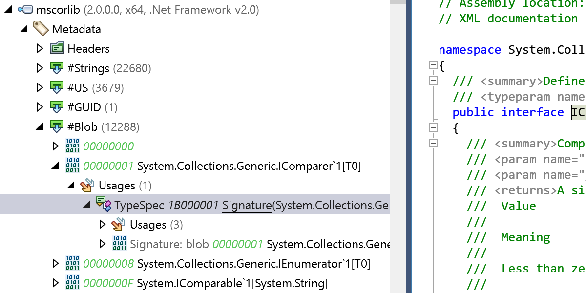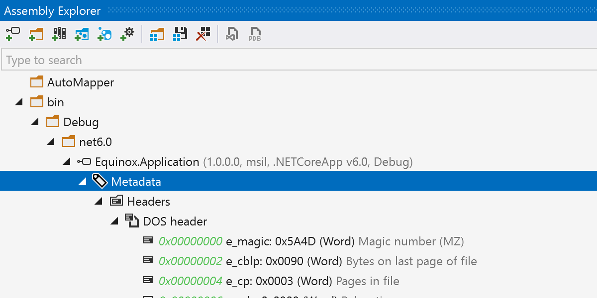 System.Private.CoreLib。 XML 文档的路径现在会显示在反编译文件的标题中。 [TypeForwardedTo] 特性)。 Locate in Metadata(在元数据中定位)操作也适用于转发类型、程序集和模块引用以及资源。