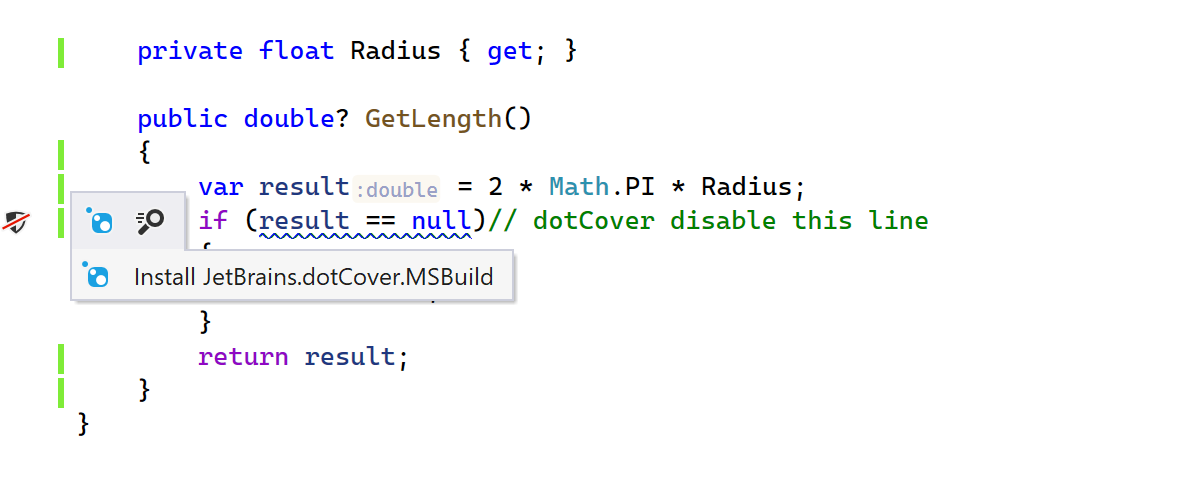 要使某一选项起作用,必须引用 JetBrains.dotCover.MSBuild NuGet 软件包。 这是一个仅用于开发的依赖项,不会作为运行时依赖项添加到项目中。