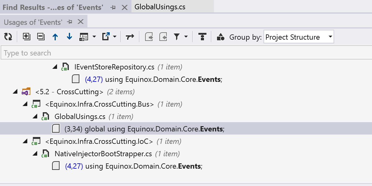 Find Usages(查找用法)和扩展方法的代码分析中支持 global using 功能。