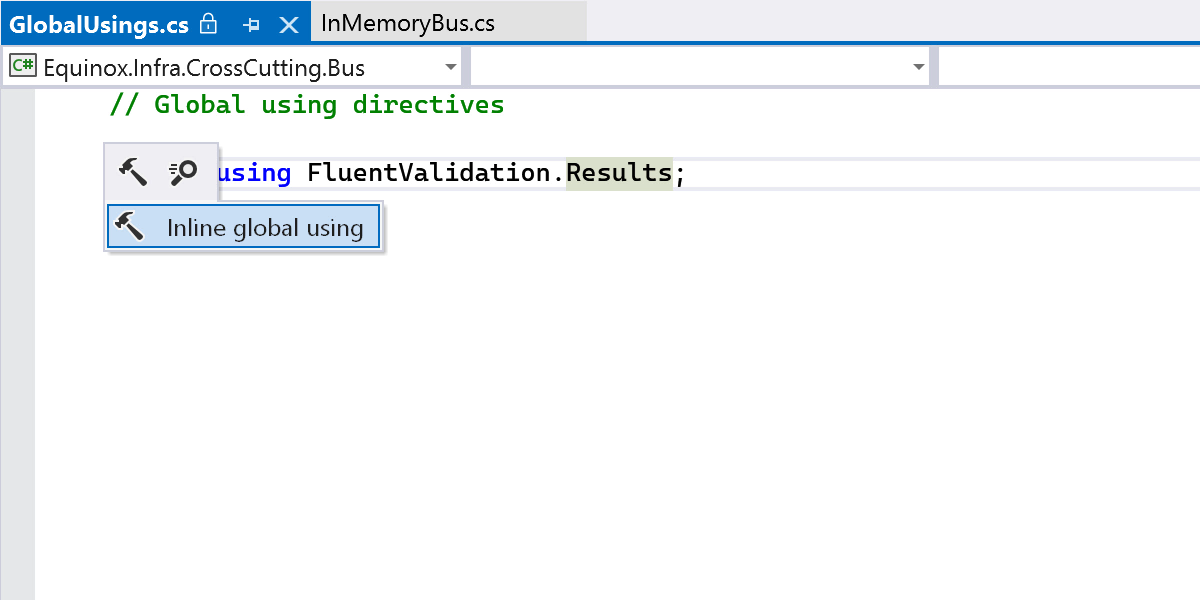 如果您决定将 global using 重构为常规 using,Inline Global Using(内联 Global Using)重构也可以提供帮助。 在 global using 上调用时,它会将其从 GlobalUsings.cs 中移除,并将相应的 using 语句添加到项目中需要的文件中。