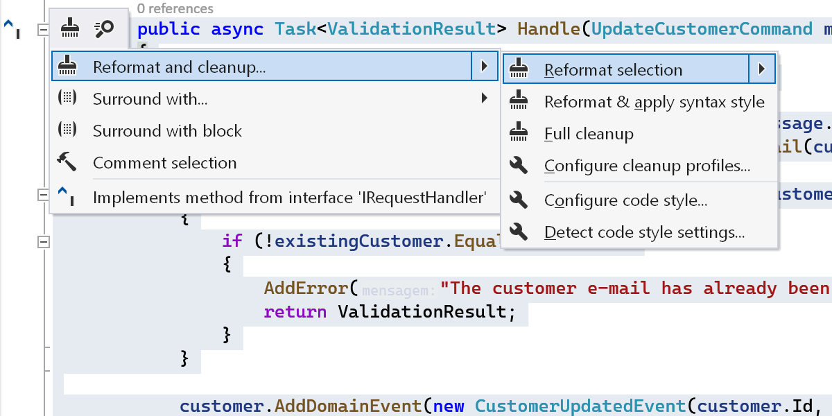 我们重新组织了 Alt+Enter 菜单中与 Code Cleanup(代码清理)和 Formatting(格式设置)相关的所有条目。 Format selection(设置选区格式)、Cleanup selection(清理选区)和 Apply syntax style(应用语法样式)合并为一个 Reformat and Cleanup(重新格式化和清理)条目,提供单个入口点。