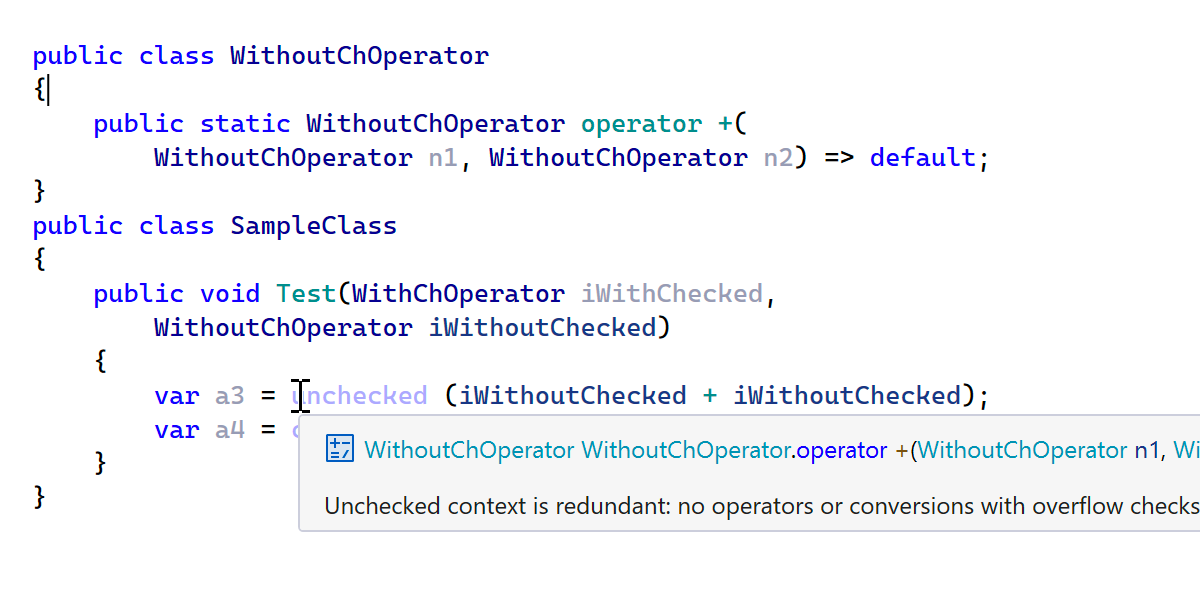 更新的 Unchecked/checked context is redundant(unchecked/checked 上下文冗余)检查能够在此上下文中使用 checked 运算符时将其纳入考量。