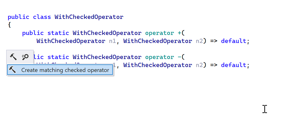 如果您还没有在代码库中使用 checked 运算符但想开始添加,可以使用新上下文操作 Create matching checked operator(创建匹配 checked 运算符)。 它适用于每个用户自定义运算符,可在 Alt+Enter 菜单中一键生成运算符的 checked 版本。